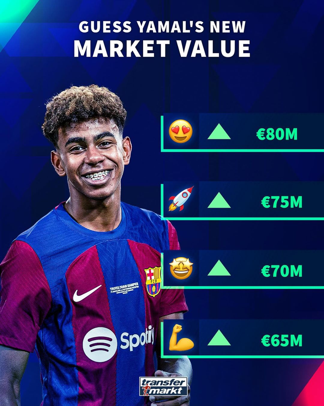 3月21日消息 德转更新动态,巴萨16岁前锋亚马尔的身价即将迎来调整,他的身价将继续上涨!目前亚马尔德转估值为6000万欧。