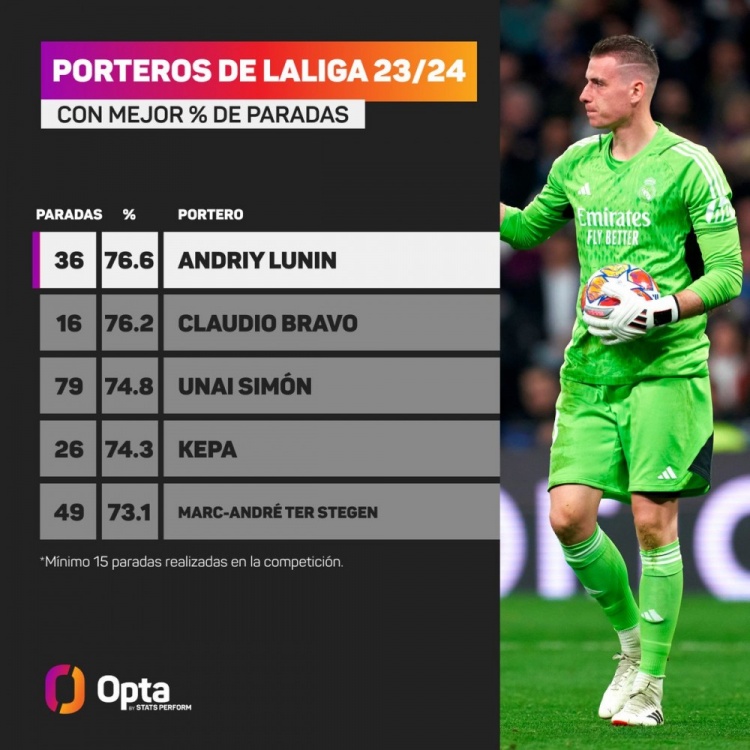 3月22日消息 Opta统计了西甲门将本赛季的扑救成功率,并列出榜单,皇马门将卢宁以76.6%成功率居首。