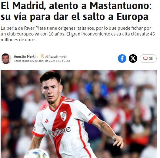 4月6日消息 据《阿斯报》报道,皇马有意签下16岁阿根廷小将马斯坦托诺(Franco Mastantuono)。随着其他欧洲俱乐部对马斯坦托诺兴趣不断升温,皇马同样也对这名小将产生了兴趣。