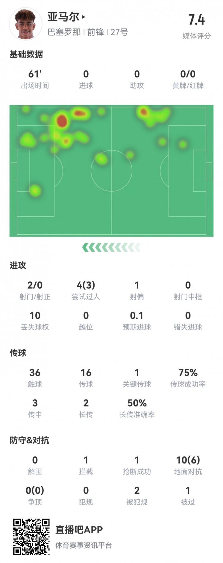 4月11日消息 欧冠1/4决赛首回合,巴黎主场暂2-2巴萨。16岁亚马尔首发出战61分钟被换下,球员全场重点数据如下↓