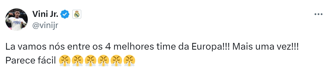 维尼修斯写道:我们又跻身欧洲最强的四支球队了,再一次,听起来很简单