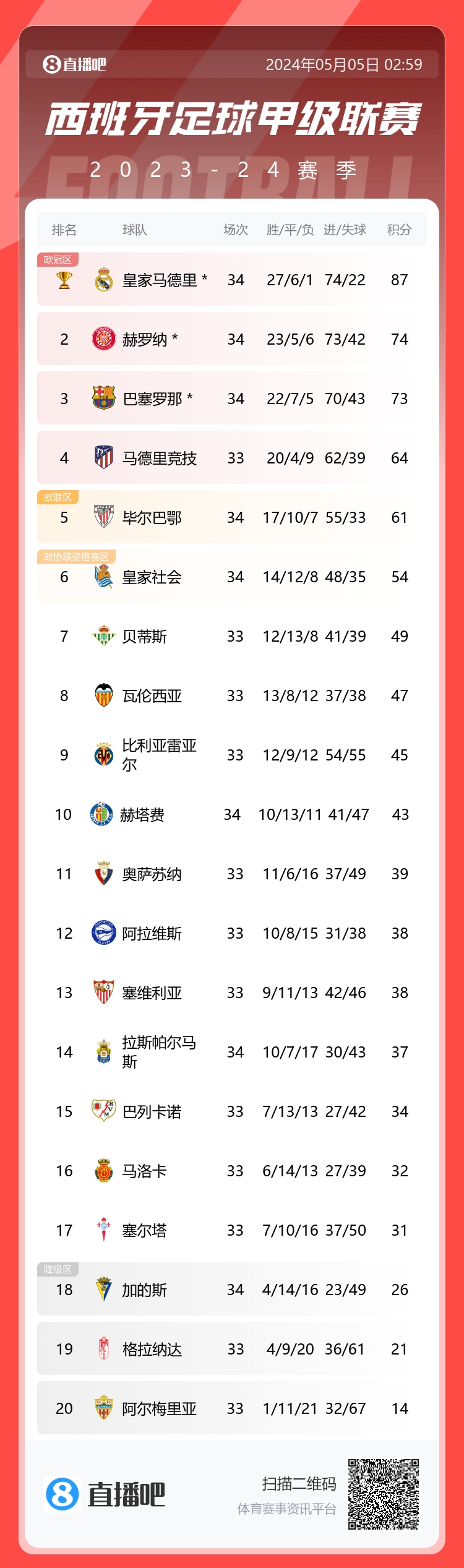 5月5日消息 西甲第34轮,皇马3-0加的斯,赫罗纳4-2巴萨。