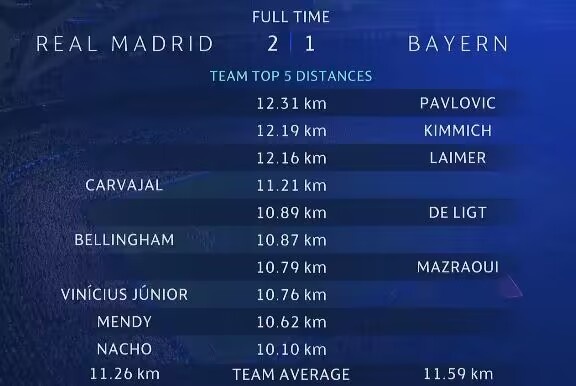 5月9日消息 欧冠半决赛次回合,皇马2-1拜仁,总比分4-3淘汰对手。据欧冠官方数据统计,本场跑动距离最多的三名球员都是拜仁球员。