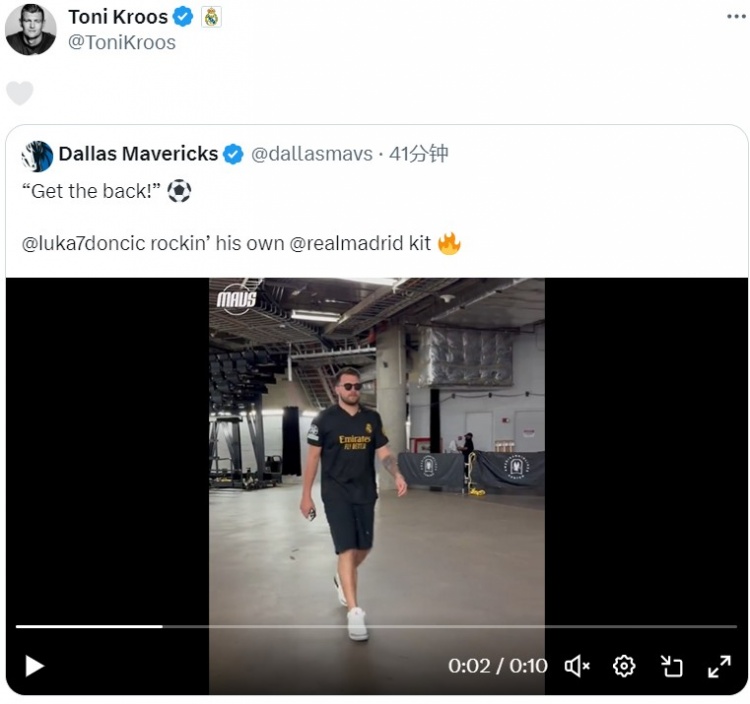 NBA球星东契奇身穿皇马77号球衣入场,克罗斯转发评论