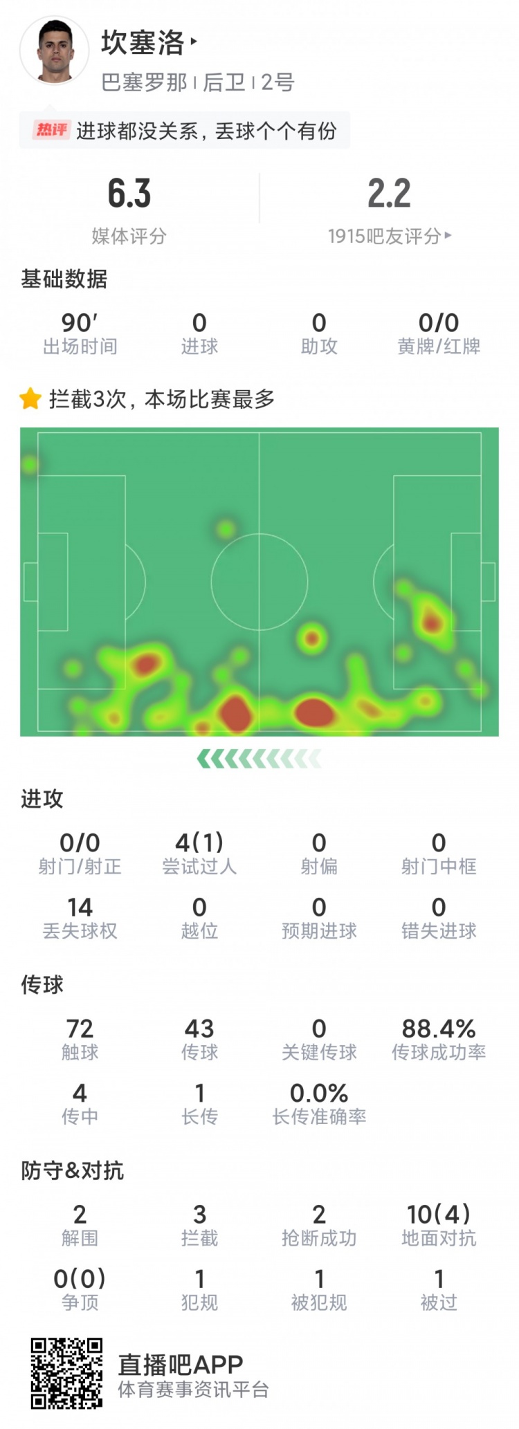连续两场拉胯,坎塞洛本场数据:3拦截,2抢断,评分仅6.3分