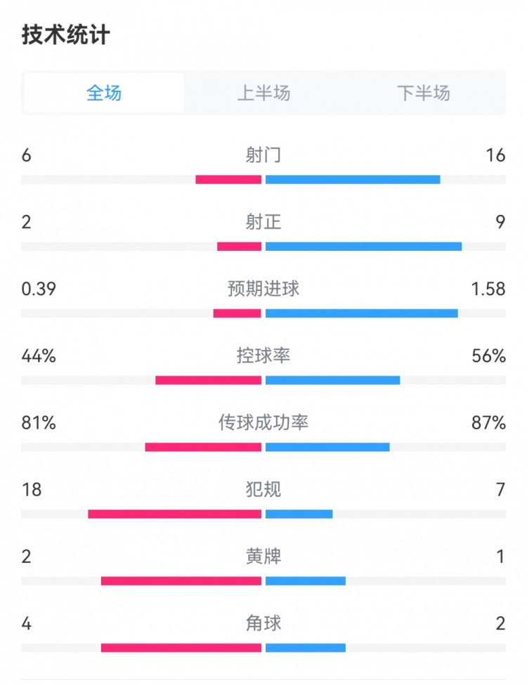 皇马1-0马洛卡全场数据:射门16-6,射正9-2,犯规7-18