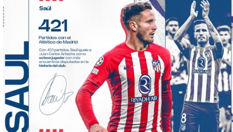 里程碑!萨乌尔为马竞出场421次,追平阿特彻并列队史第八位