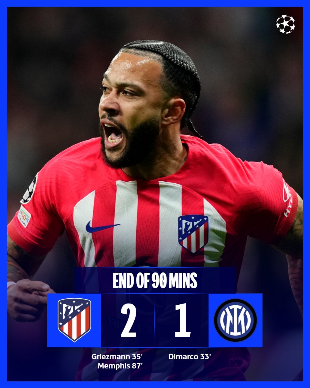 德佩第87分钟破门,马竞2-1国米总比分2-2扳平
