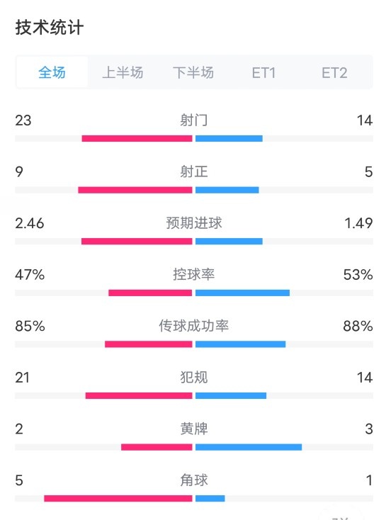 马竞VS国米120分钟数据:射门23-14,射正9-5,犯规21-14