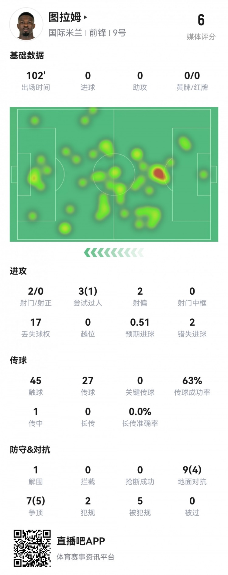 图拉姆本场数据:2射0正2次错失良机,17次丢失球权,全场最低6分