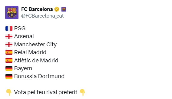 巴萨官方发起投票:选择你想交手的欧冠8强球队