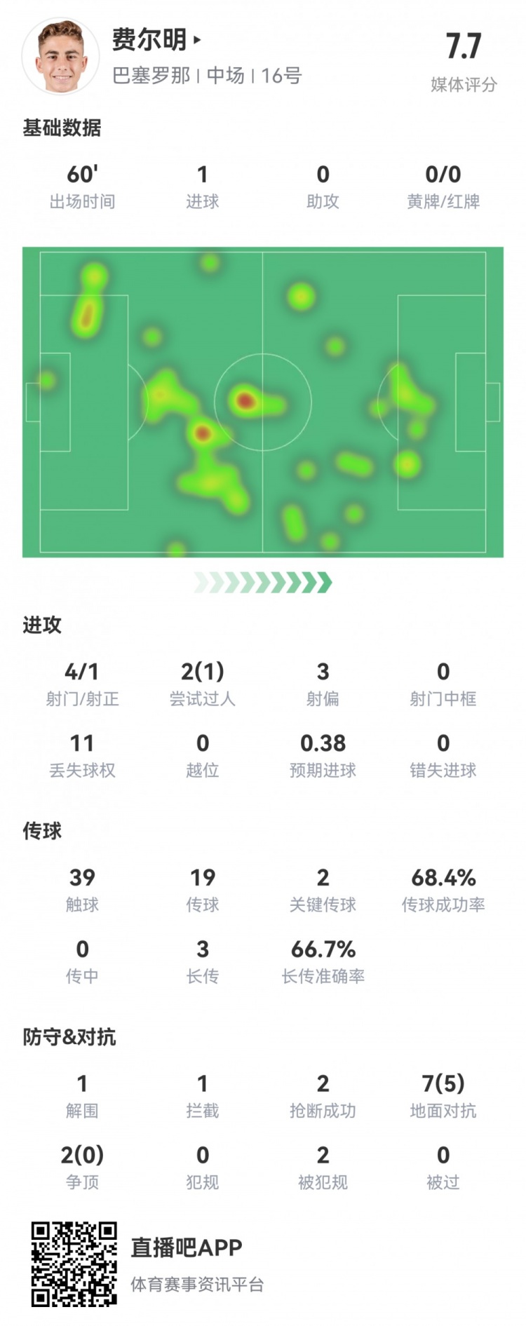 费尔明本场数据:4射1正,1粒进球,2次关键传球,评分7.7