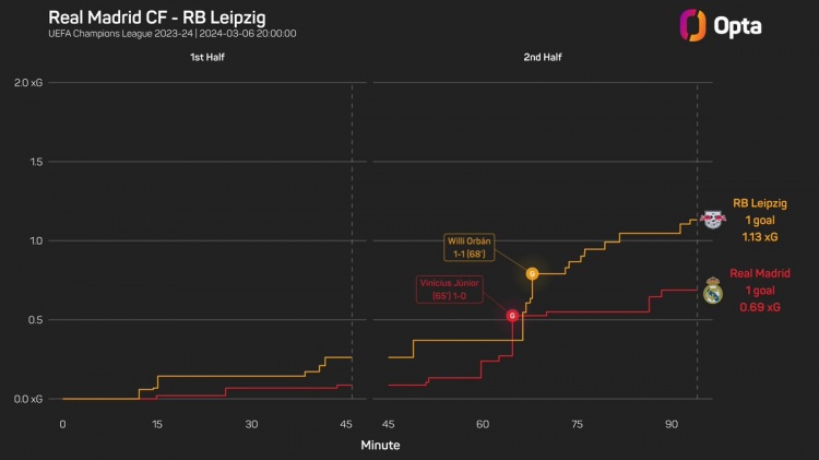 有惊无险,皇马本场遭莱比锡20次射门&自2018年欧冠主场最多