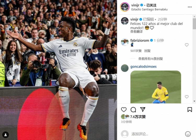 维尼修斯庆祝晋级:祝世界上最好的俱乐部122周岁生日快乐