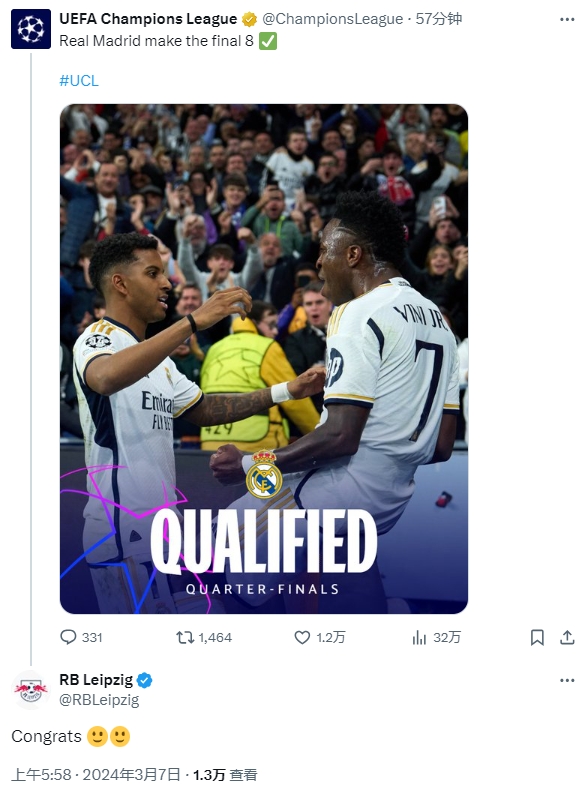 欧冠官推祝贺皇马晋级,莱比锡评论“恭喜”+“呵呵”emoji
