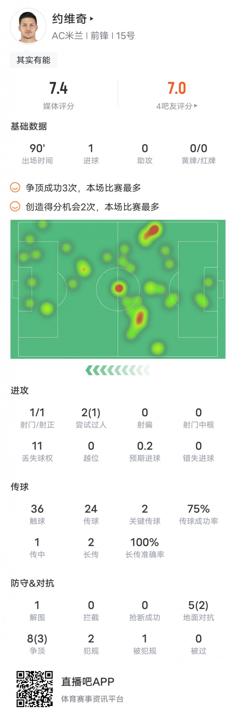 2月23日消息 在今日凌晨进行的一场欧联杯1/8决赛附加赛次回合较量中,AC米兰2-3雷恩,总比分5-3晋级。约维奇为红黑军团首发出战,打进1球,送出2次关键传球,评分7.4。