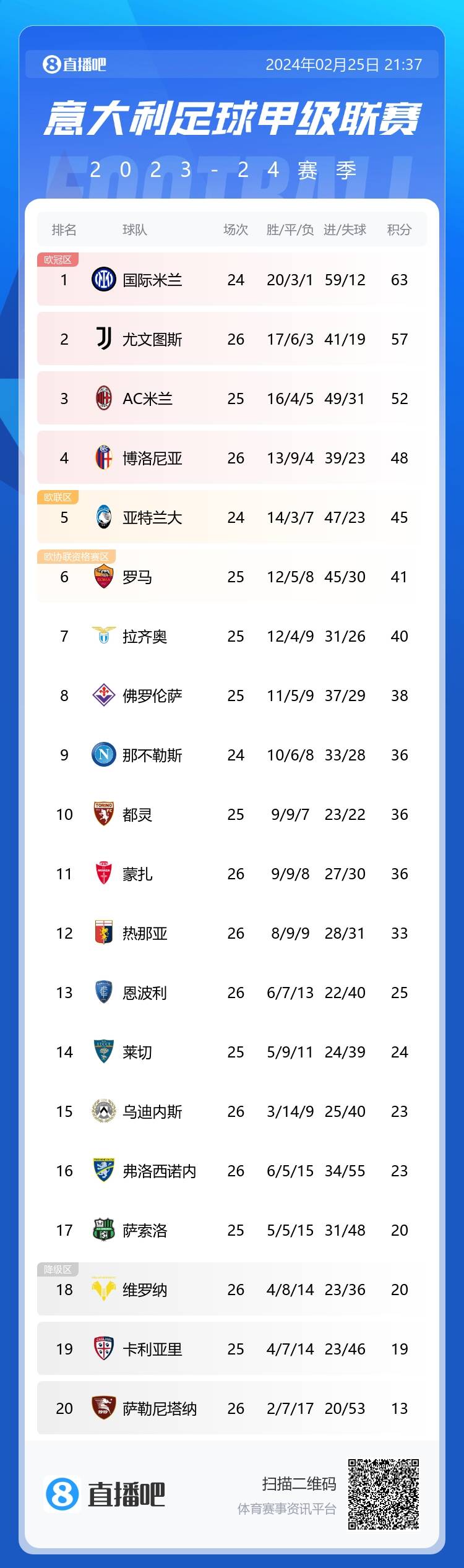 意甲积分榜↓