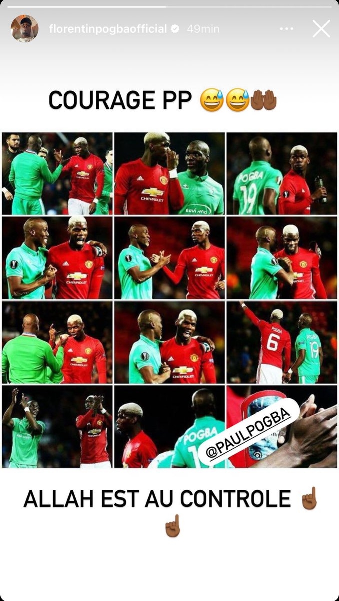 弗洛伦丁晒出两人此前在赛场上的合影,并写道:保持勇气,PP(保罗-博格巴的首字母)。一切都在真主的掌控之中。