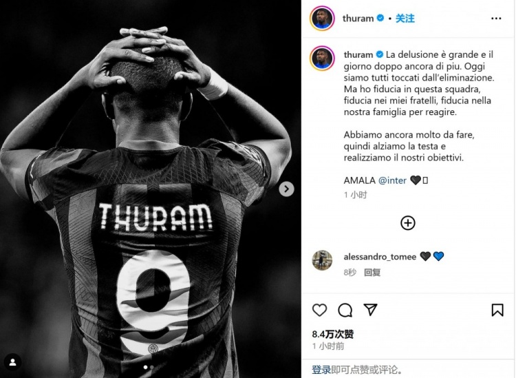 3月15日消息 欧冠1/8决赛,国米在点球大战中不敌马竞,无缘8强。赛后,小图拉姆更新了社交媒体动态,为球队鼓舞士气。