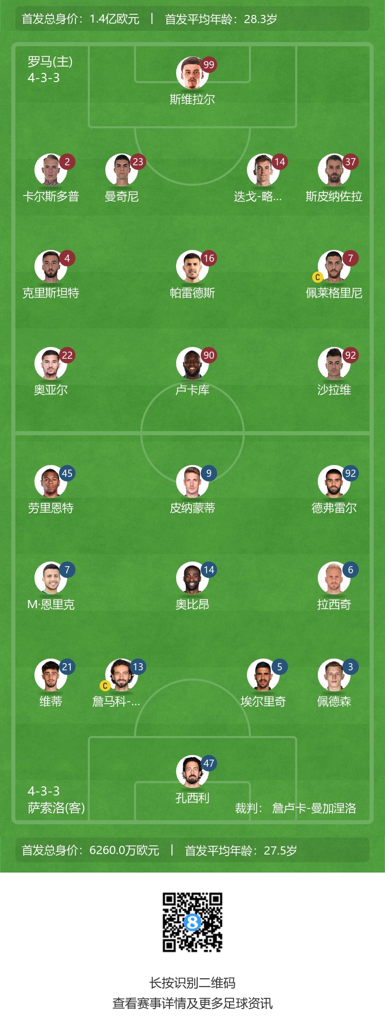 罗马首发:99-斯维拉尔、2-卡尔斯多普、23-曼奇尼、37-斯皮纳佐拉、14-略伦特、4-克里斯坦特、16-帕雷德斯、22-奥亚尔、7-佩莱格里尼、92-沙拉维、90-卢卡库