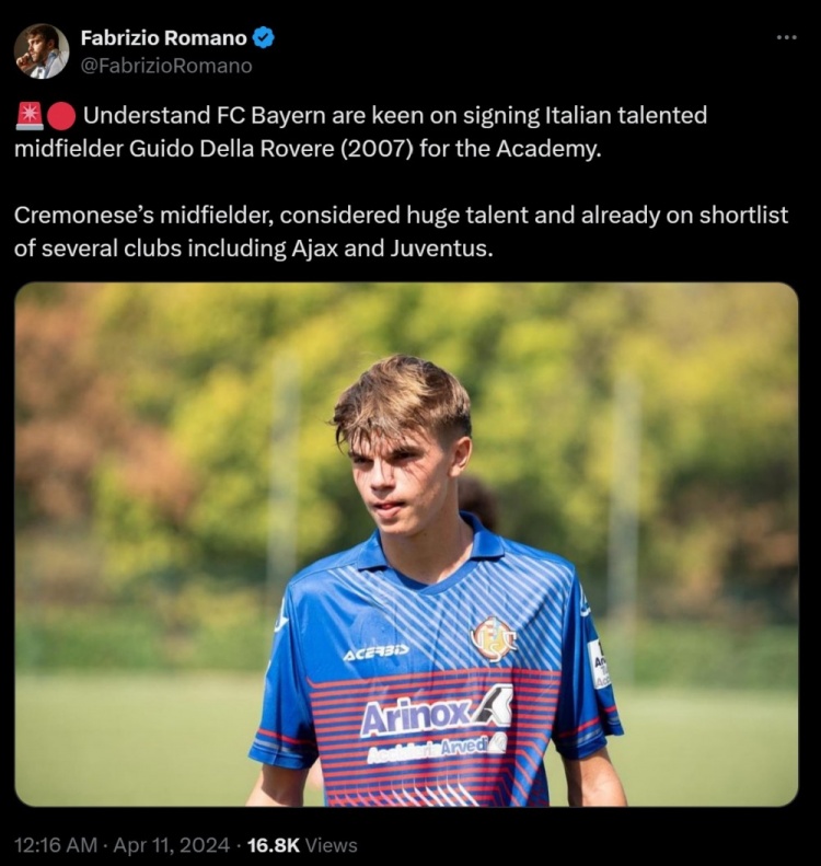 4月11日消息 据意大利名记罗马诺报道,拜仁十分希望为青训梯队签下16岁的意大利天才中场罗维尔。