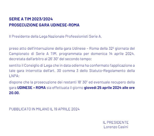 4月20日消息 官方消息,此前中断的意甲第32轮乌迪内斯vs罗马的比赛将在北京时间4月26日凌晨2点继续进行。