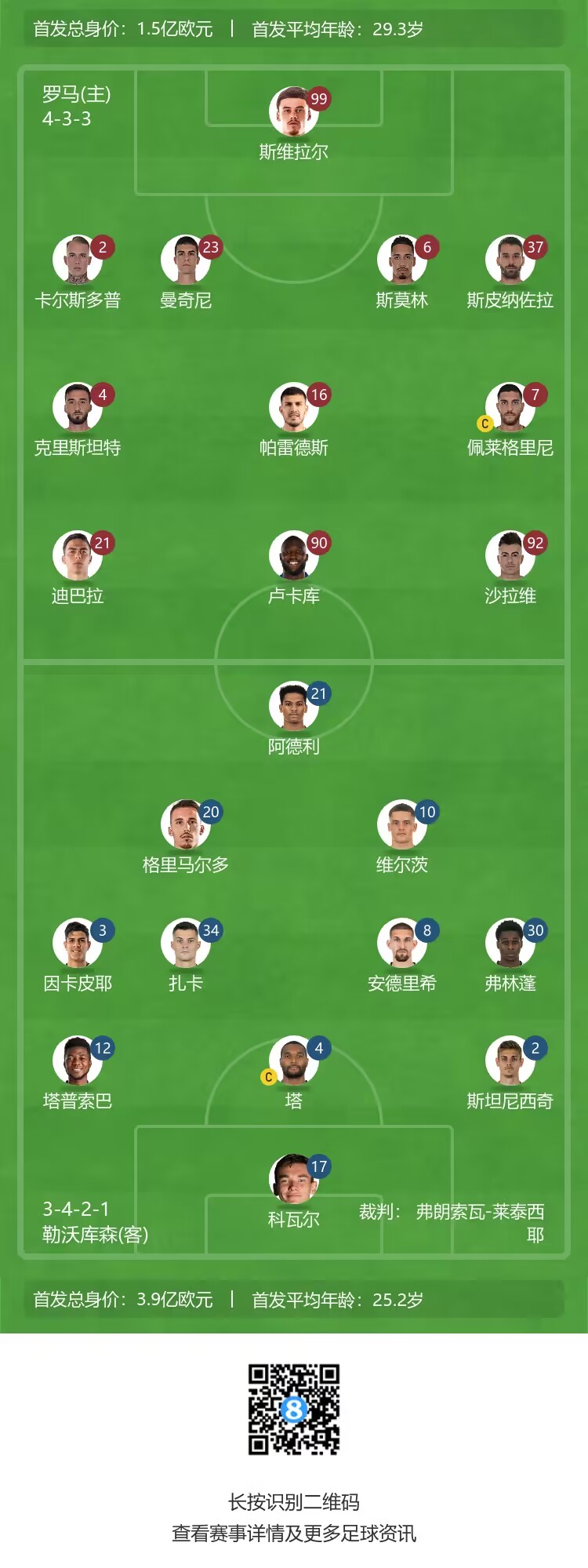 罗马首发:99-斯维拉尔、2-卡尔斯多普、23-曼奇尼、6-斯莫林、37-斯皮纳佐拉、16-帕雷德斯、4-克里斯坦特、7-佩莱格里尼、92-沙拉维、90-卢卡库、21-迪巴拉