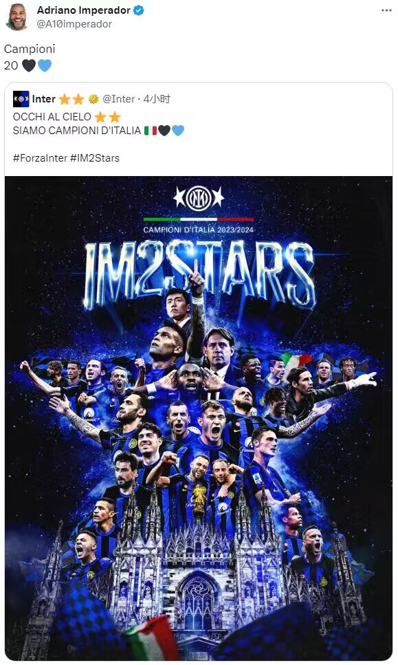 阿德里亚诺祝贺旧主国米夺得意甲冠军:冠军,20
