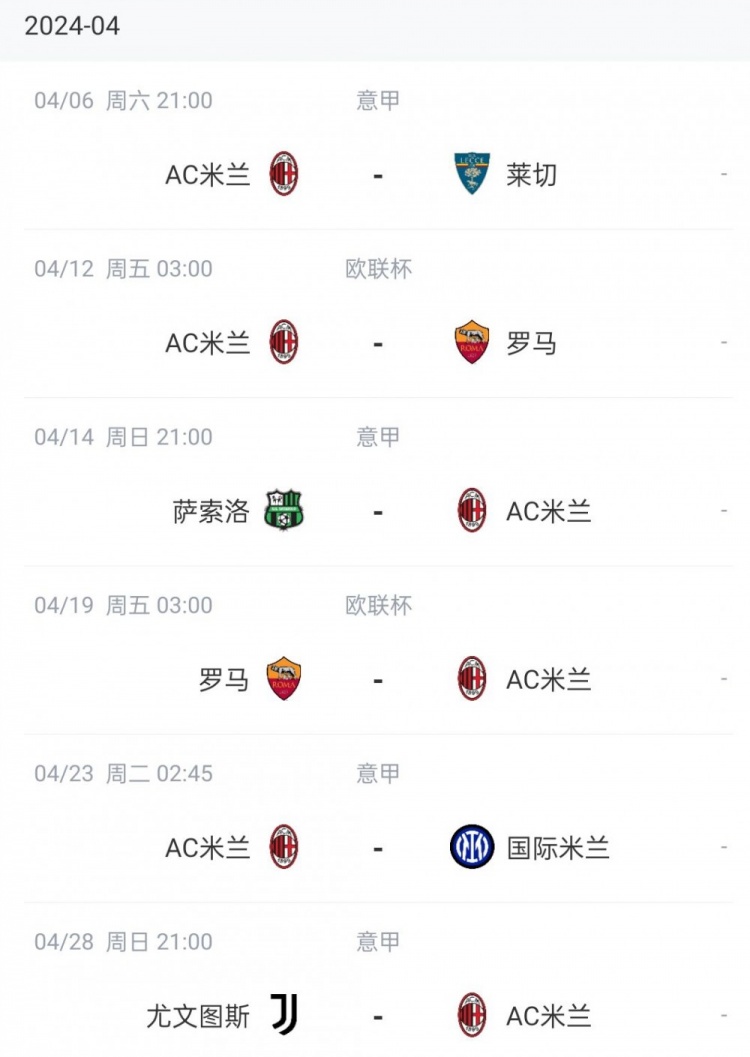 米兰4月魔鬼赛程:欧联1/4决赛先主后客战罗马 意甲连战国米&尤文