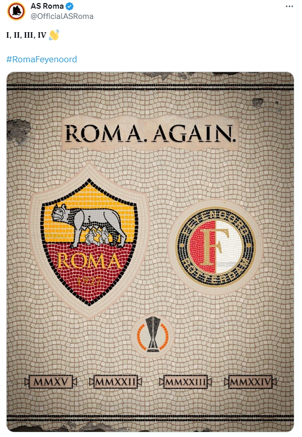 连续四次欧战获胜!罗马官推赛后嘲讽费耶诺德:1、2、3、4,再见