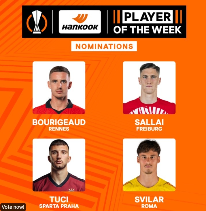 欧联官方本轮最佳球员候选:罗马门将斯维拉尔领衔,布里诺在列