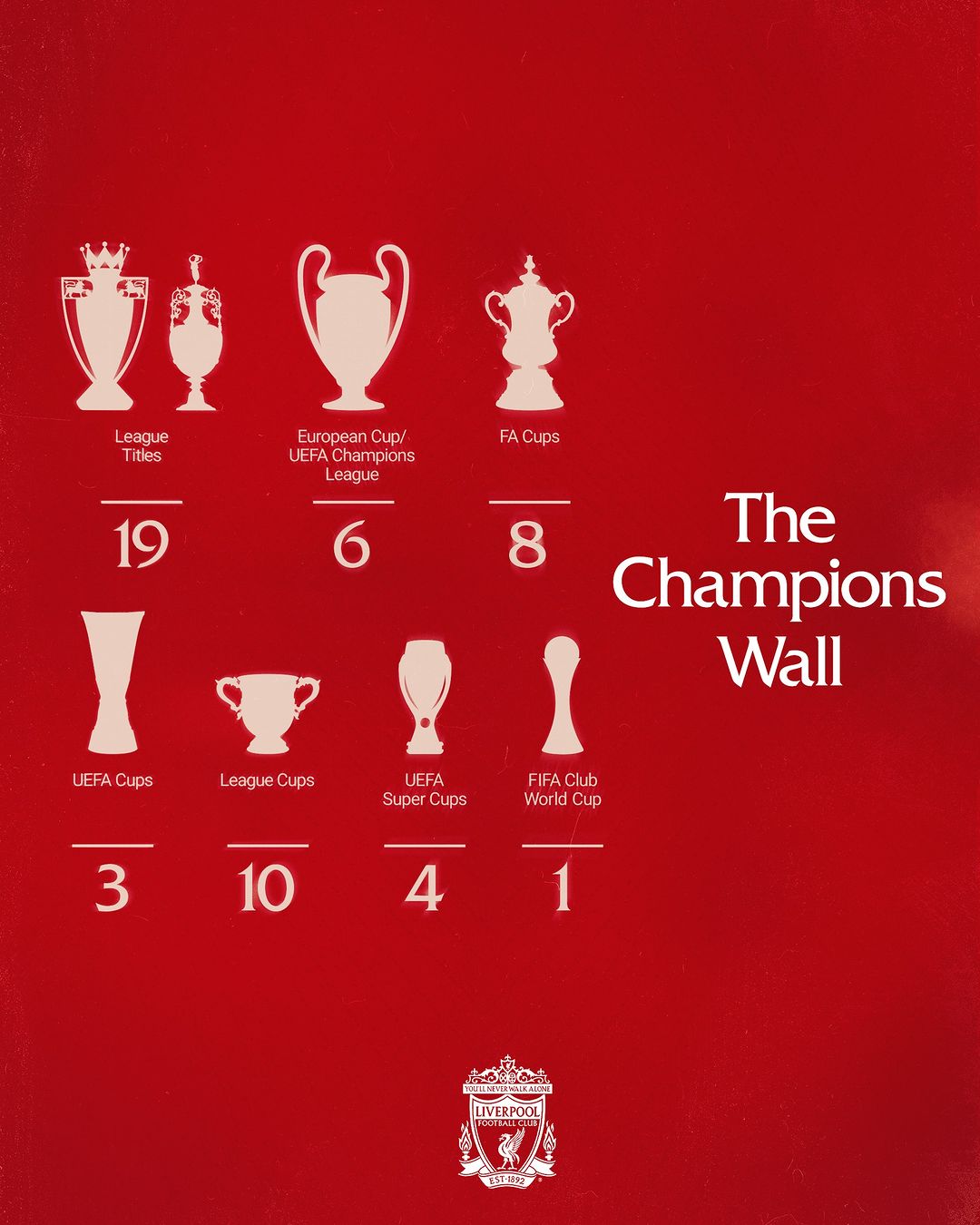 加上这座联赛杯后,利物浦冠军荣誉为: