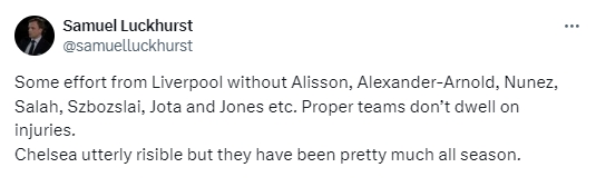 赛后,曼晚主编Samuel Luckhurst表示:“利物浦在没有阿利森、阿诺德、努涅斯、萨拉赫、索博斯洛伊、若塔和琼斯等人的情况下也能做出努力,正确的球队不会纠结于伤病。切尔西完全是可笑的,不过他们整个赛季几乎都是如此。”
