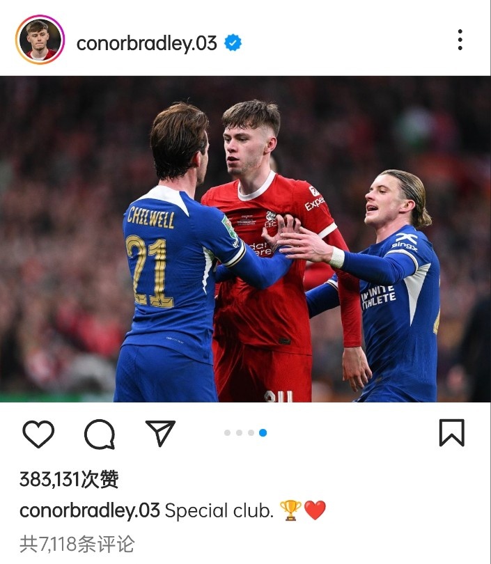 赛后布拉德利在社交媒体上疑似回击奇尔维尔,红军小将晒出了自己和奇尔韦尔争执的照片以及捧杯瞬间,他还写道:“特别的俱乐部