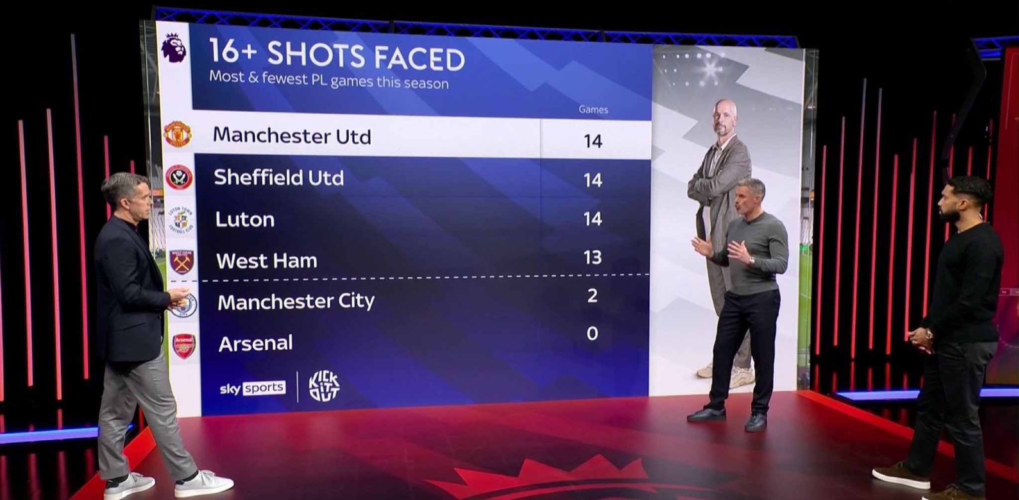 本赛季英超,曼联、谢菲联和卢顿均有14场比赛被射门达16+次,并列最多。最少的为阿森纳0场,曼城只有2场。