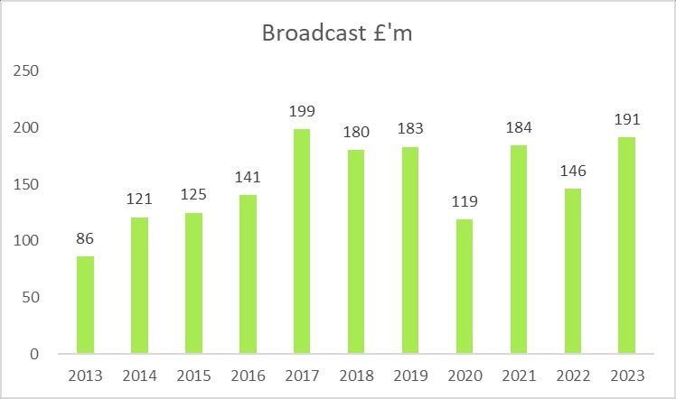 由于在英超联赛中有着更高的排名(每个位置价值310万英镑)和参与欧战,阿森纳在2022-23赛季的转播收入达到了1.91亿英镑,涨幅高达31%。