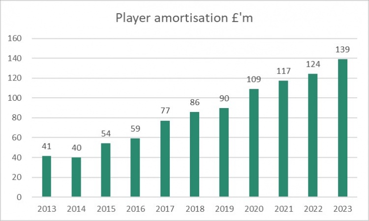 此外阿森纳的球员摊销增长12%,达到了1.39亿英镑。