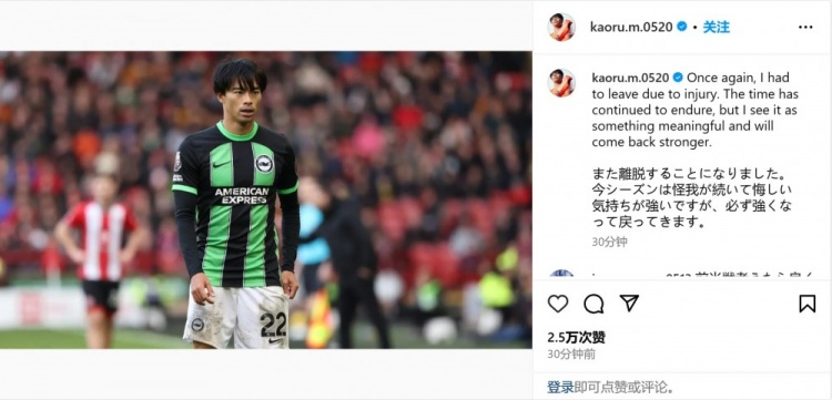 三笘薰写道:“因为伤病的原因,我不得不再次缺席。我将再次继续忍受这段时间,但我会把它看作是有意义的事情,也会以更强大的姿态回归。“