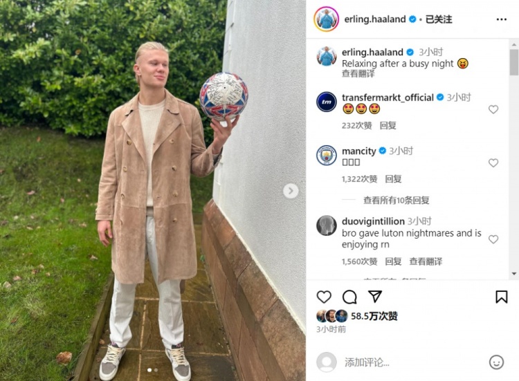 哈兰德还为此配文:忙碌的夜晚后稍事休息