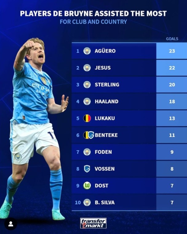 3月1日消息 根据德国转会市场网统计,阿圭罗是被德布劳内助攻次数最多的球员,达到23次,热苏斯、斯特林、哈兰德分列二三四位。