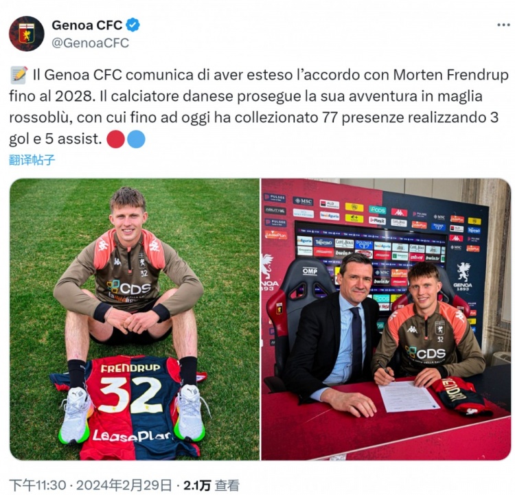 热那亚官方账号在社交媒体上晒出签字照片,确认与22岁丹麦中场弗伦德鲁普续约,新合同期限到2028年。