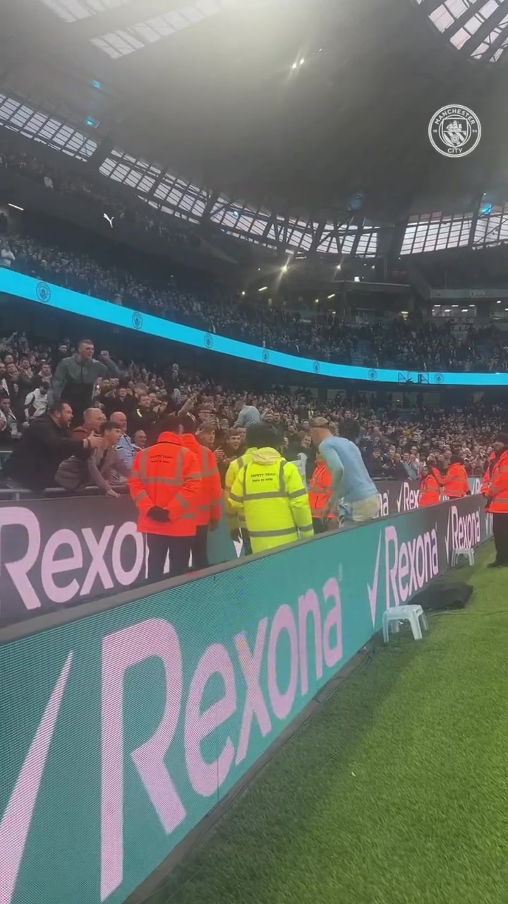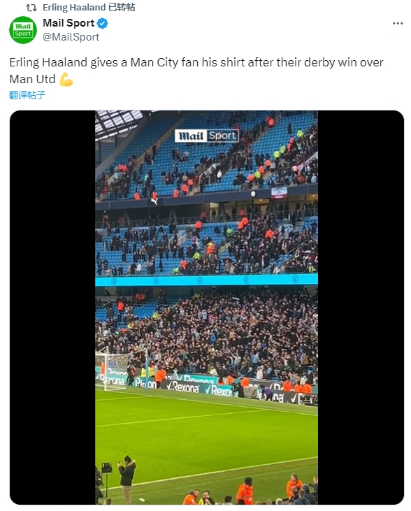 在赛后,哈兰德将该场比赛身穿的球衣脱下来,亲手赠送给了球门后的一位曼城球迷。