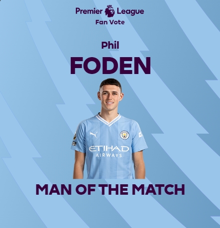 3月4日消息 本赛季次回合曼市德比结束,曼城主场3-1击败曼联。赛后,梅开二度的福登当选了本场比赛的全场最佳球员。