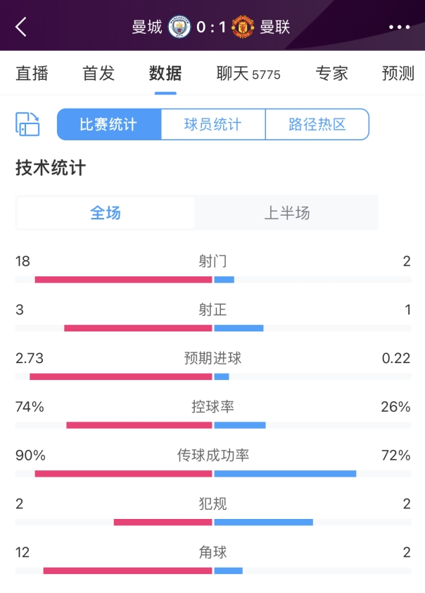 03月04日消息 曼市德比半场结束,曼联1-0领先曼城,半场数据如上图。