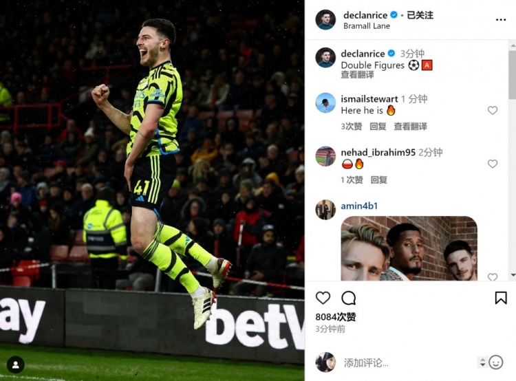 本赛季赖斯在英超打进5球并送出5记助攻,总计参与10粒进球,赛后赖斯在社交媒体上晒出自己庆祝进球的照片,并写道:“两位数⚽️