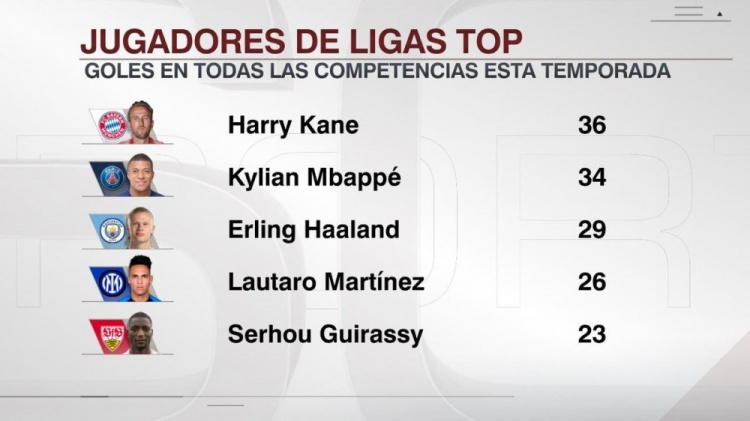 ESPN统计了本赛季五大联赛球员在所有俱乐部赛事中的进球数量,并列出榜单,凯恩以36球居首。