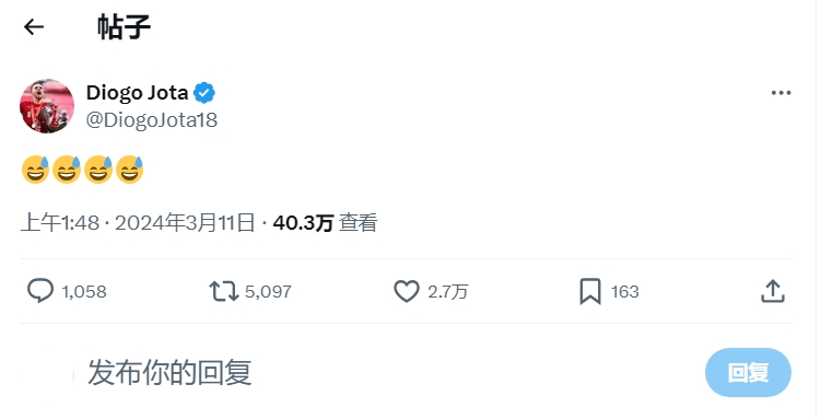 03月11日消息 利物浦1-1战平曼城赛后,若塔社媒发了4个