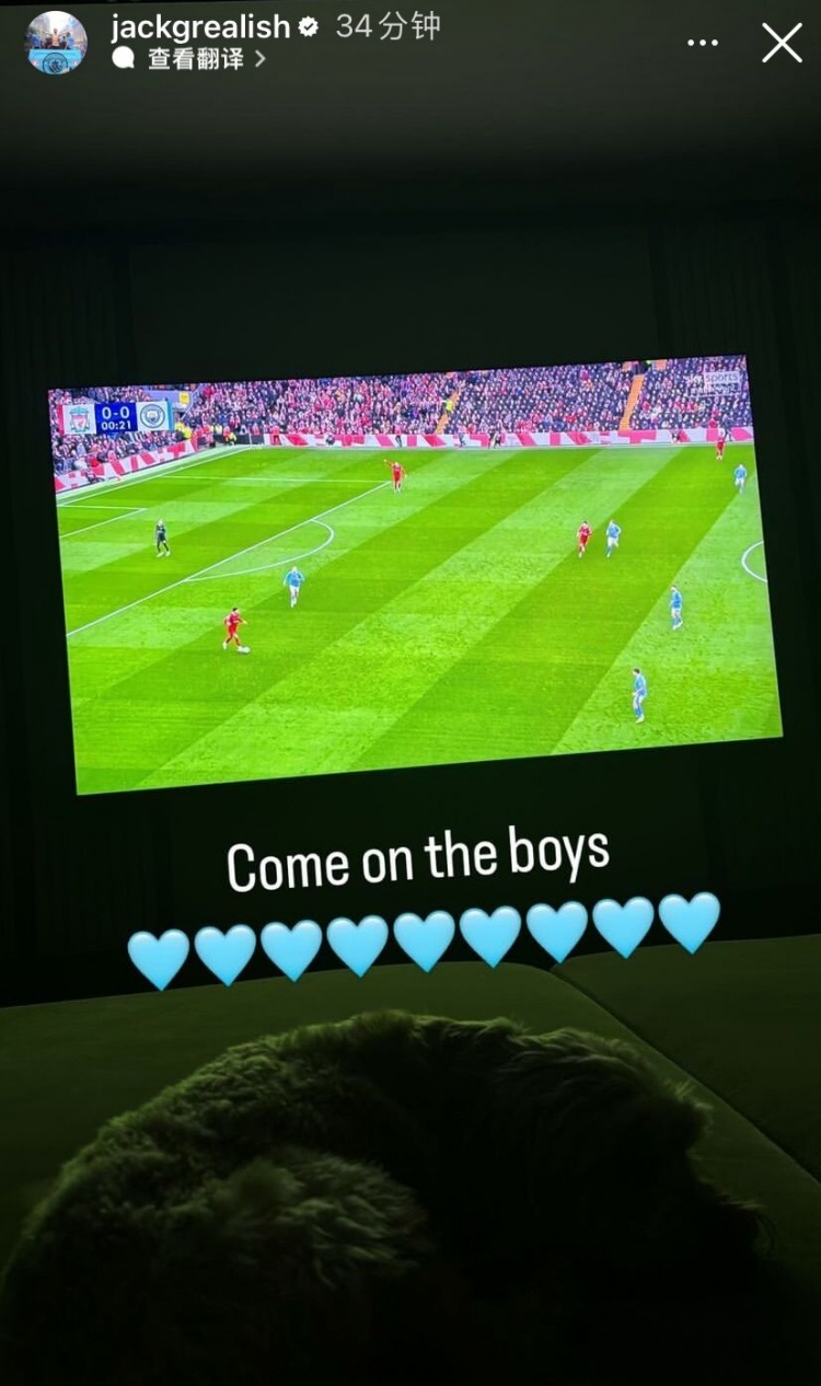 3月11日消息 英超天王山之战,曼城客战利物浦的比赛正在进行。有伤在身的格拉利什也在家中观看这场比赛,并为队友们加油。