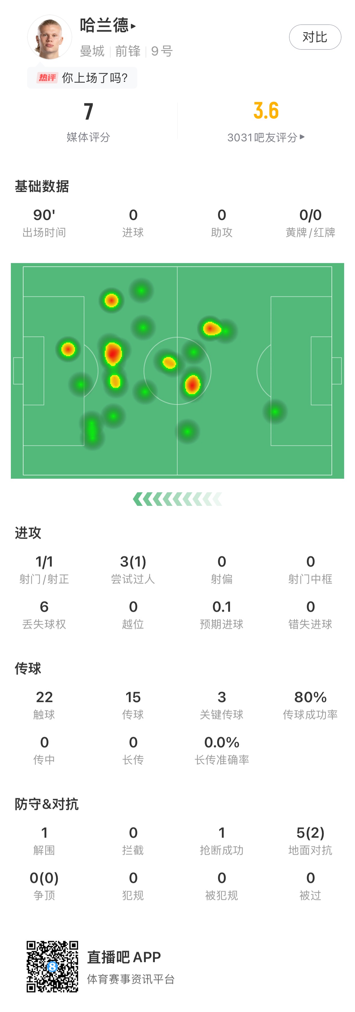 本场比赛哈兰德首发打满全场,触球次数共22次。据WhoScored统计,哈兰德在利物浦禁区触球次数仅有1次。