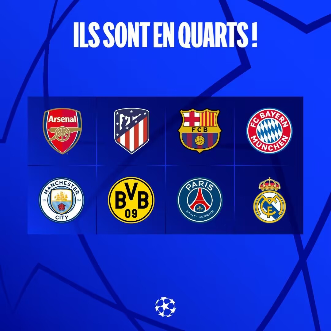 欧冠1/4决赛全部结束,本赛季欧冠8强全部出炉:皇马、巴萨、拜仁、曼城、巴黎、阿森纳、马竞、多特。